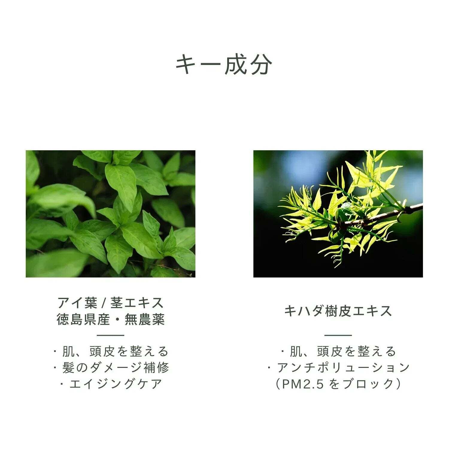 ①アイ葉/茎エキス:肌、頭皮肌を整える、髪のダメージ修復