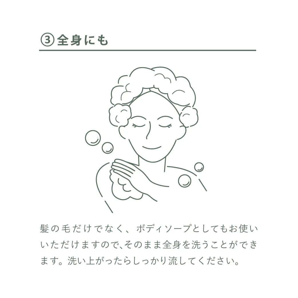 髪だけでなく全身に使用でき、肌にも優しく、しっとり洗い上げます♪