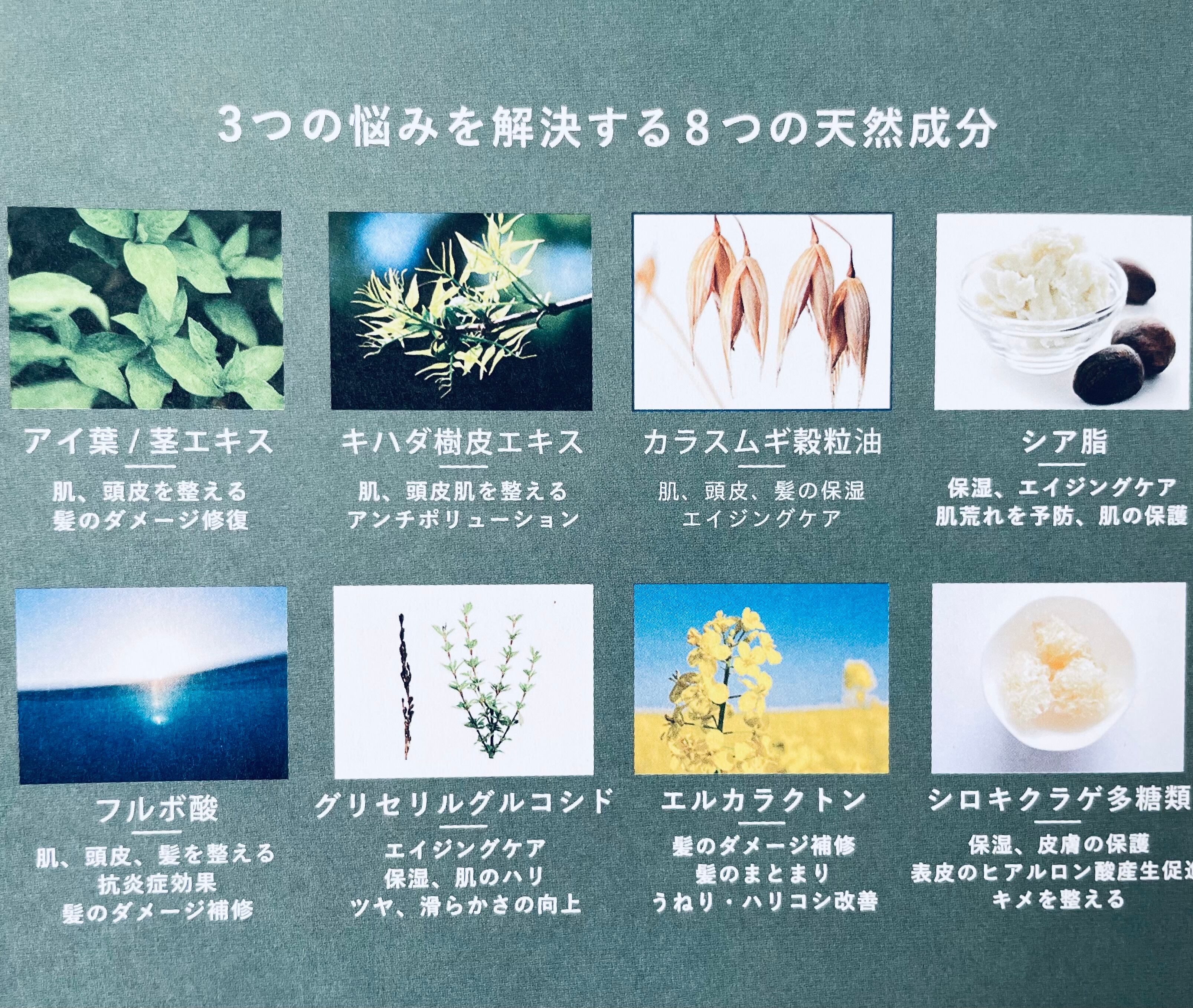 《頭皮、髪、肌の3つの悩みを8つの天然成分で解決》