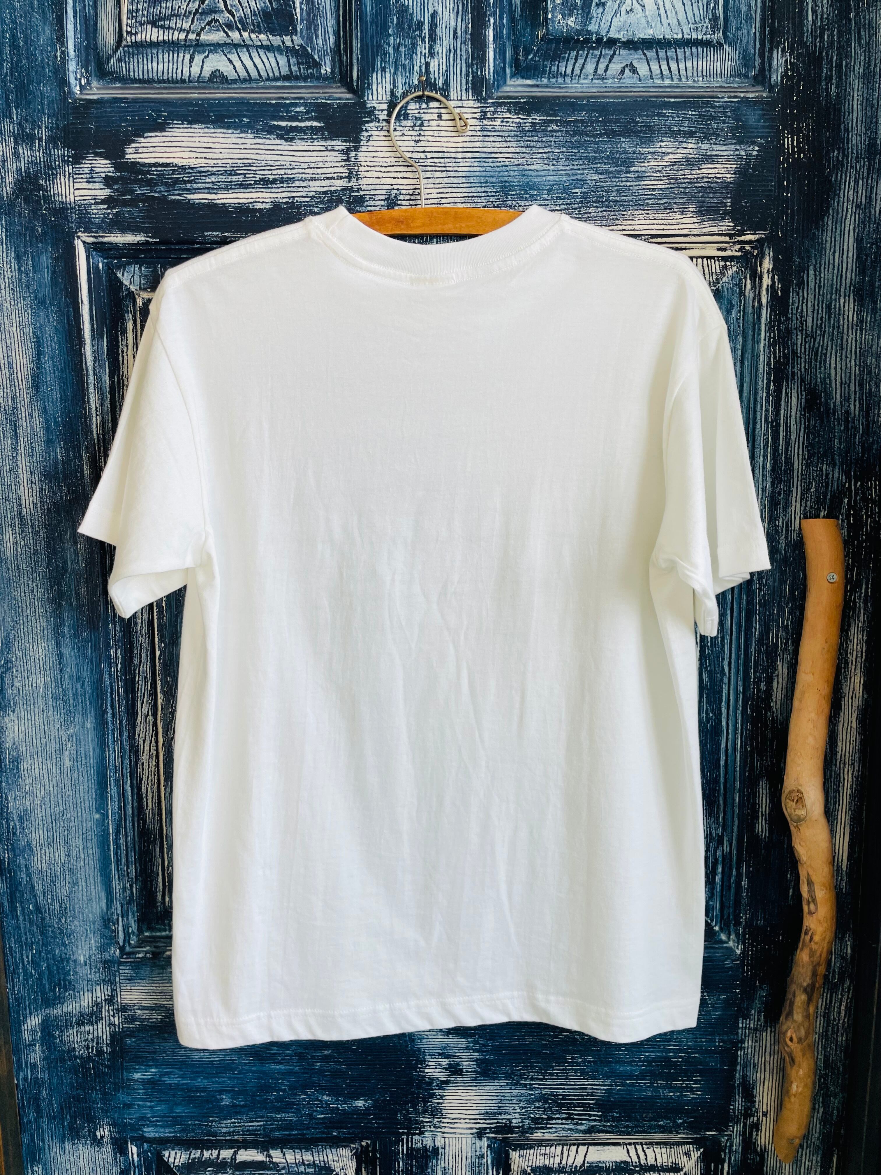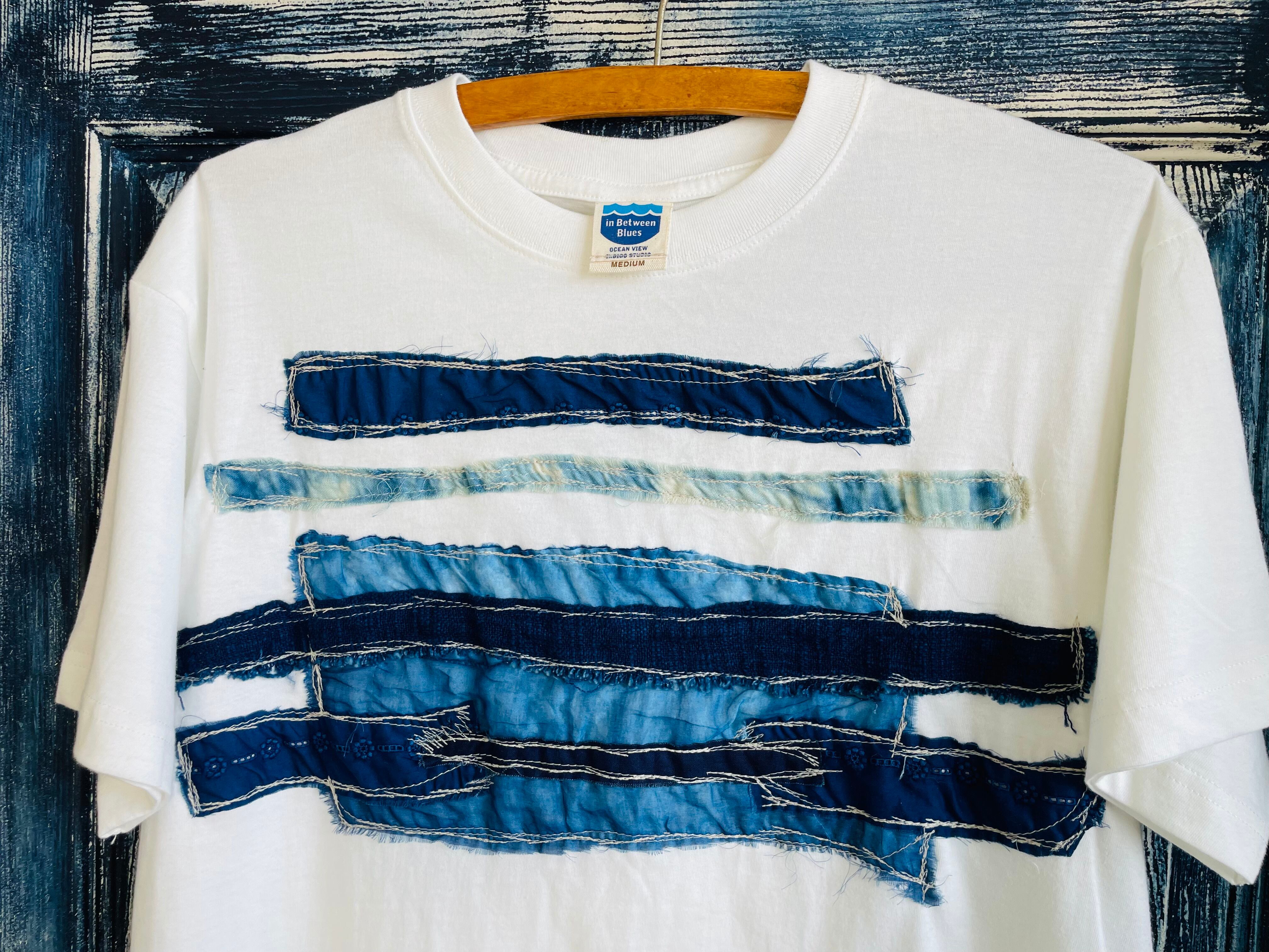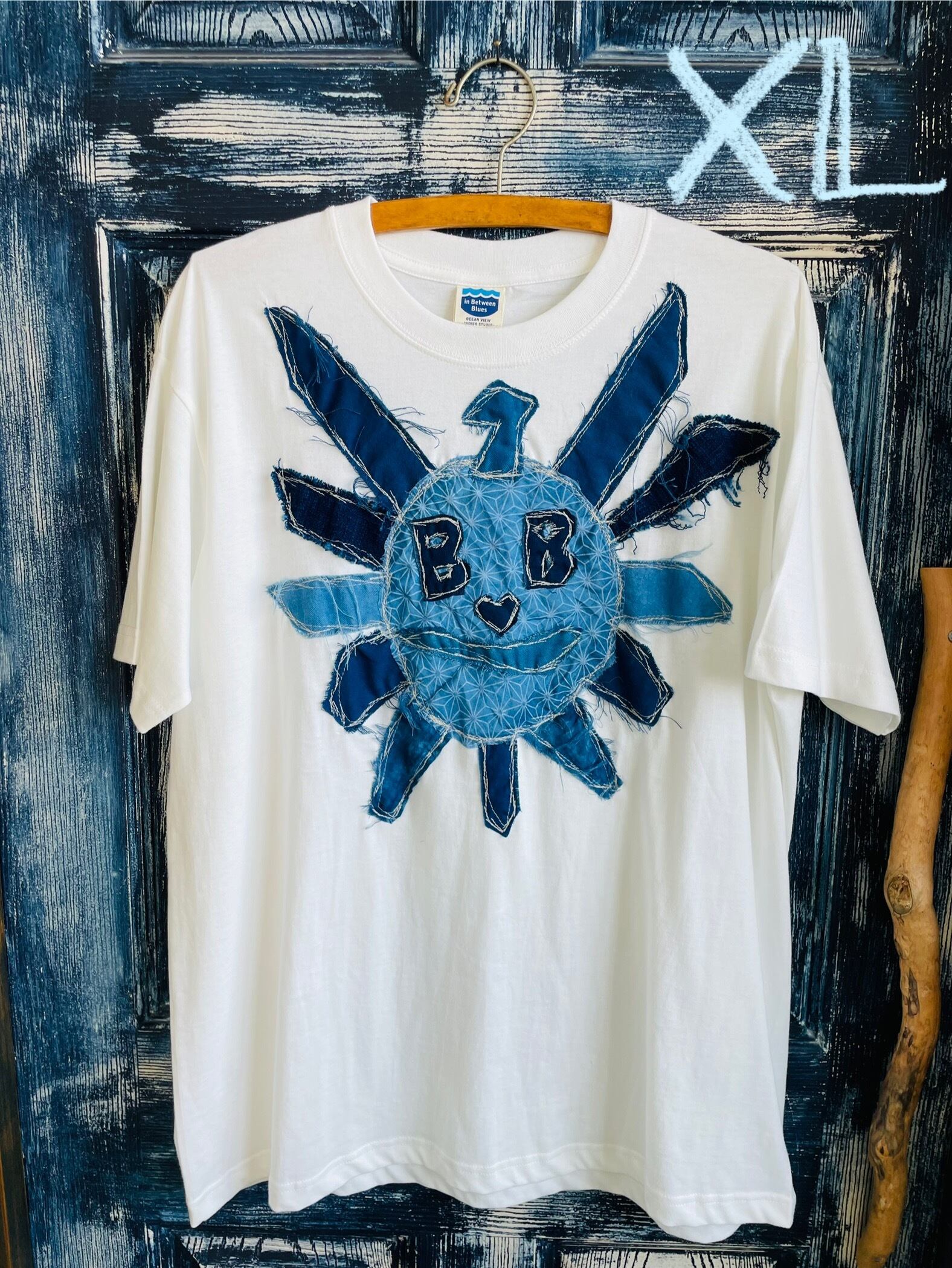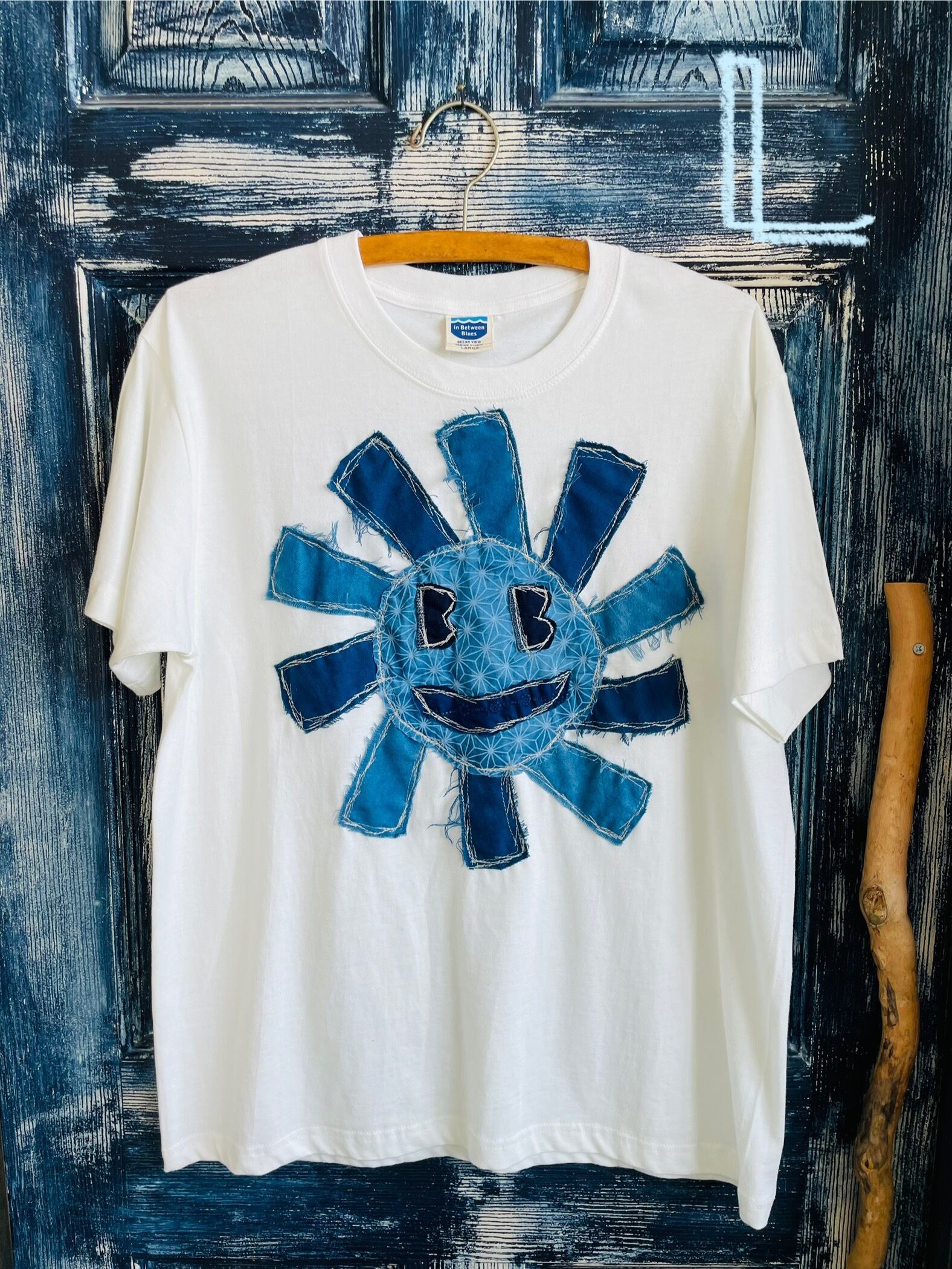 藍のハギレ布を使ってお任せアートTシャツを製作してもらいました。