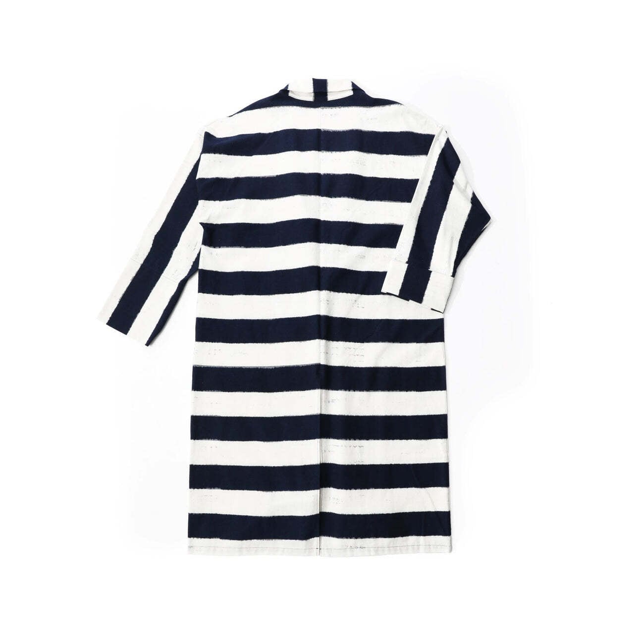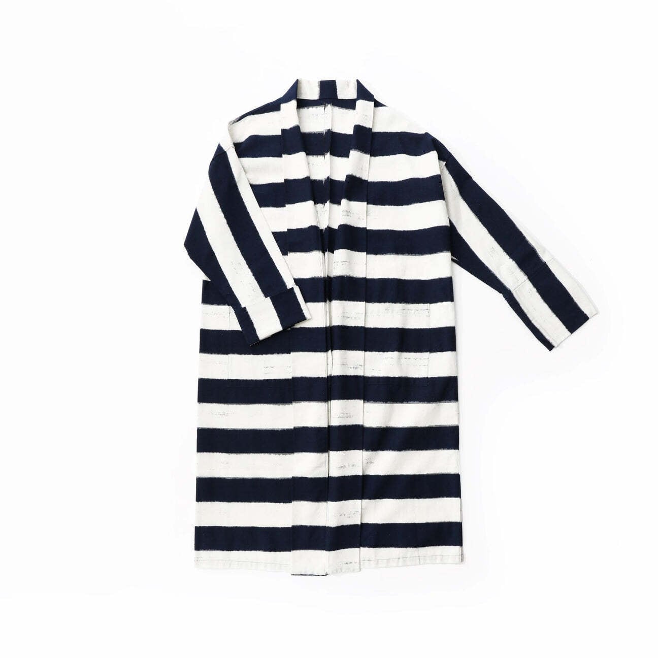 天然藍染めで染めた緯糸(よこいと)が織りなす力強い縞模様が、まとうことで元気をくれます。